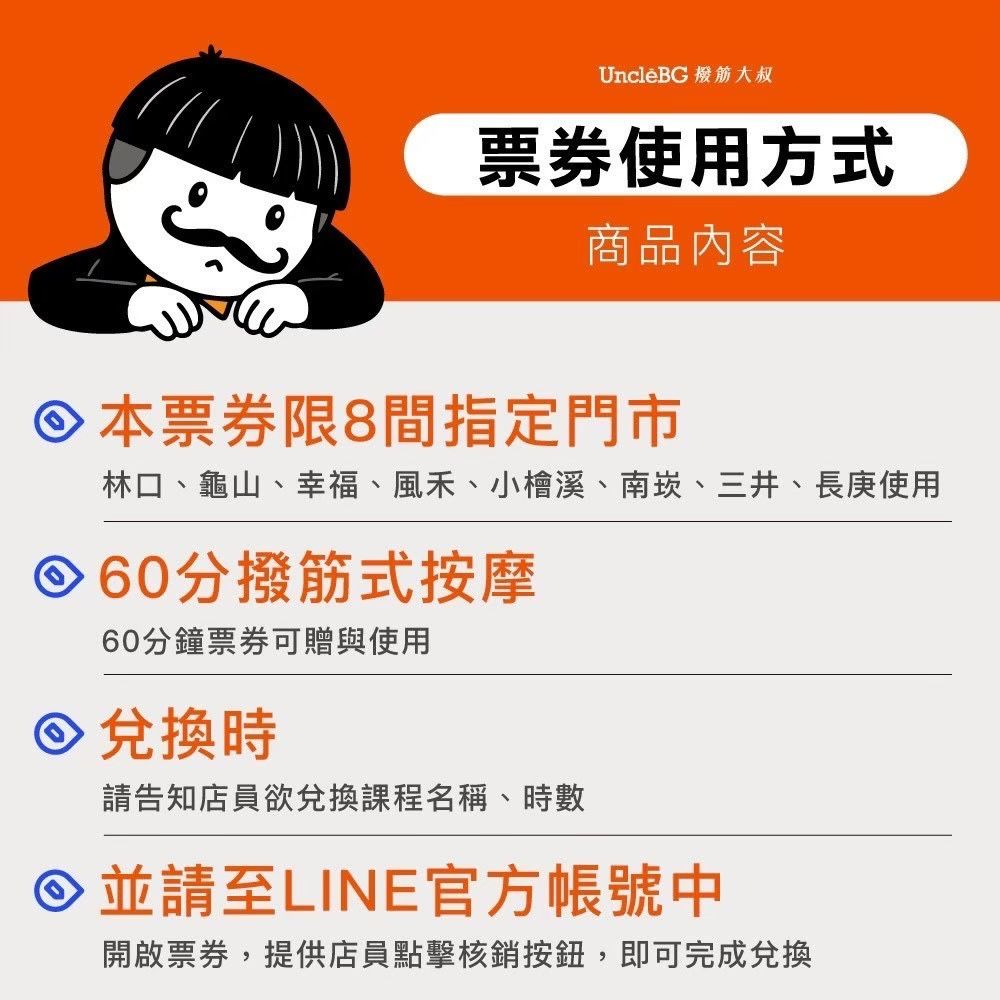 1. 本券平假日限單人使用兌換【筋石堂】60分鐘撥筋按摩課程體驗歐享券乙次。