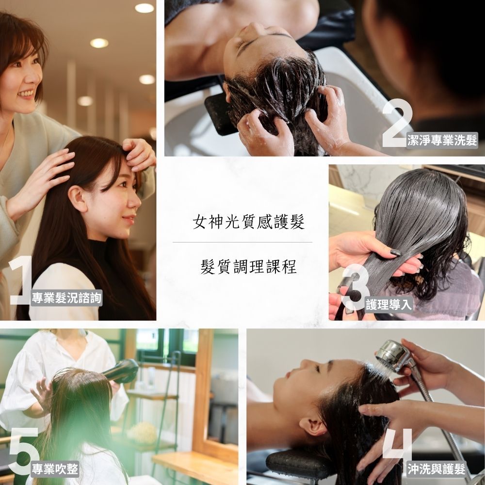 服務內容包含:專業髮況諮詢、深層潔淨洗髮 (使用義大利原裝進口 ATLA 洗髮精)、高效修護精華護理導入 (使用美斯特高效修護精華)、沖洗與護髮 (使用義大利原裝進口 ATLA 護髮乳)、專業吹整。